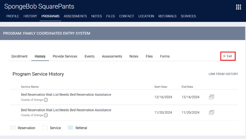 Clients may need to be exited from the Family Coordinated Entry System (FCES) for a multitude of reasons such as the client being housed, no longer needing FCES services, or there has been no communication with the family. Exits are commonly occurring and the exits should be properly noted. To exit a family from FCES, follow the steps below.