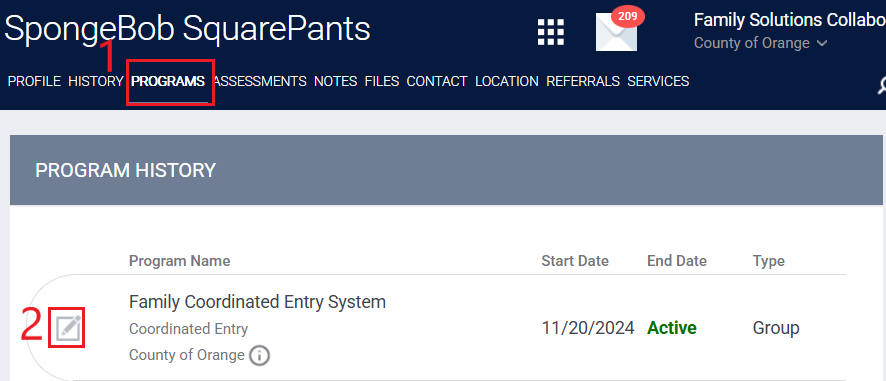 Step 1: Search for the client’s profile that you want to exit, go to the programs tab and select the edit icon that appears on the left of the active FCES enrollment.