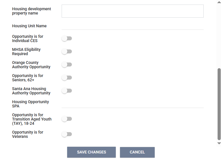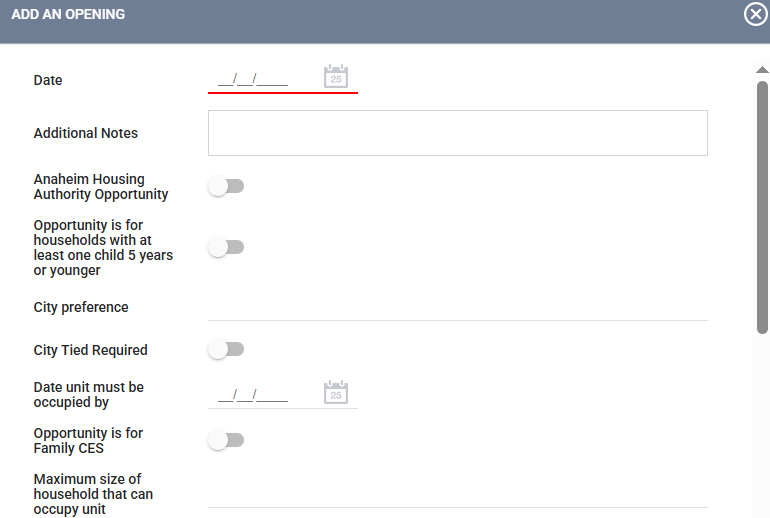 - Opportunity is for Family CES: Push the toggle so the opportunity is matched through the Family Coordinated Entry System