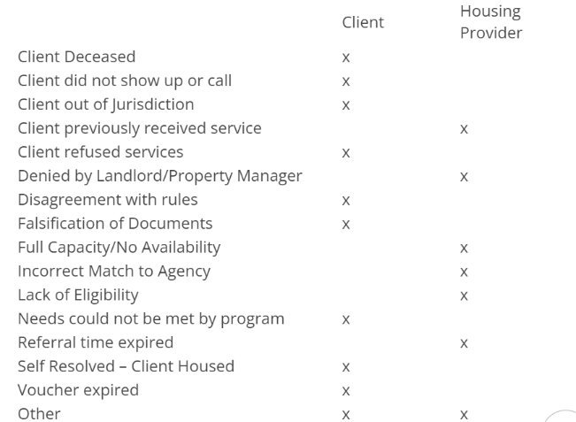 - No: Selecting No means the household will not be sent back to the CQ and will not be rematched to another shelter opportunity. This should only be selecting if the household decides they no longer need shelter services through CES or if contact was not established.