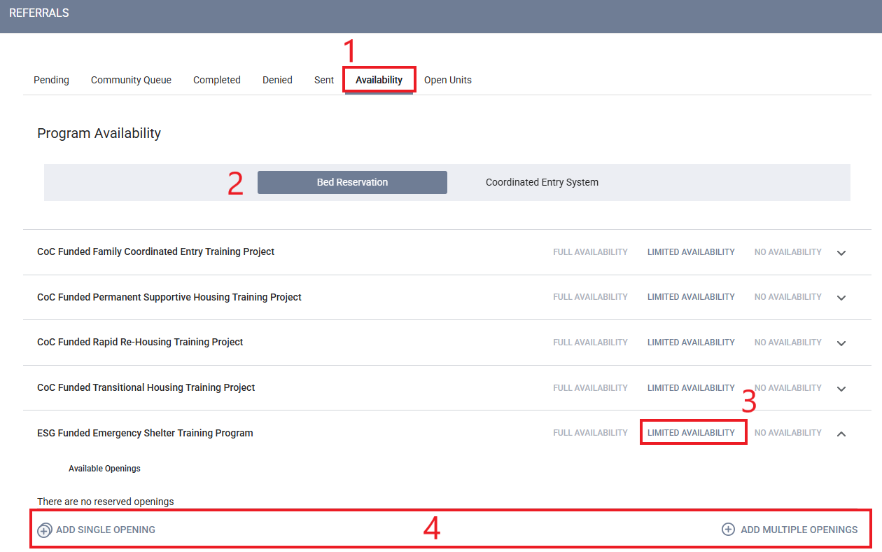 Step 2: Within the Referrals tab, select on Availability then on Bed Reservation. A list of all the projects for your agency will appear. Select Limited Availability for the shelter project you are opening. Then, click on the drop-down button next to the shelter project. You will have the options to add a single opening or multiple openings. Please note: Do not set any project to Full Availability because openings for the project will not appear on the FCES Bed Reservation Available Shelter Opportunities Report. Also, if you select on multiple openings, all openings will be the same so if you have multiple openings to post with different criteria, add them as single openings.