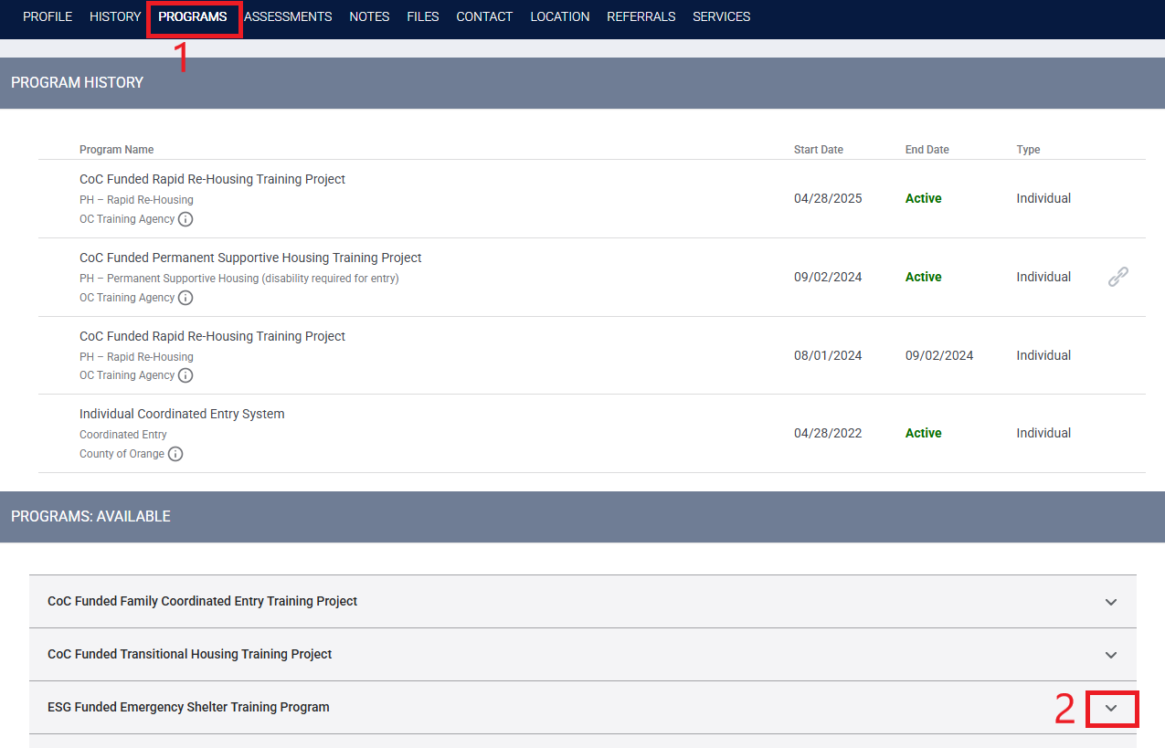 Step 1: Within the Programs tab of the household you are enrolling, click on the down arrow next to the shelter project the household was referred to.